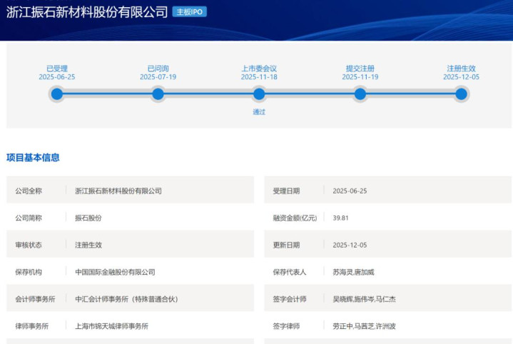 振石股份在上交所主板上市的速度非常快,2025年6月25日交表,11月18日就过会,12月5日通过注册,预计未来两个月内可以上市。