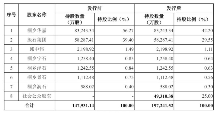 IPO后,桐乡华嘉持股为42.2%,振石集团持股为29.55%,邱中伟持股为1.11%,桐乡宁石持股为0.64%,桐乡泽石持股为0.63%,桐乡景石持股为0.56%,桐乡润石持股为0.3%。