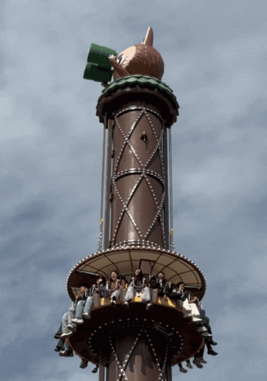 观光跳楼机摒弃单一失重刺激,可旋转的观光设计,让游客在游玩之余,尽览湖面风光与园区城堡景致。
